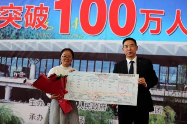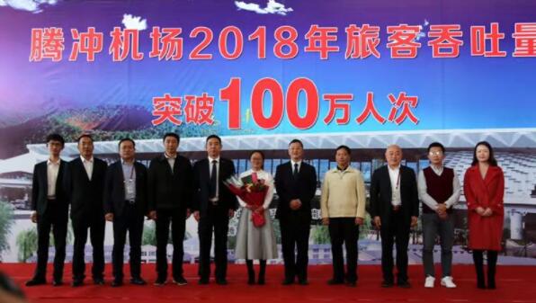 15時整,騰沖機場在T2航站樓舉行了年旅客吞吐量突破100萬人次紀念活動。趙歡旅客在得知自己成為第100萬名幸運旅客信息後,提前到機場辦理了乘機手續,並參加活動。雲南機場集團和騰沖市政府領導向趙歡旅客贈送鮮花、免費機票、飛機模型等紀念品,及熱海養生閣溫泉酒店免費住宿一晚。