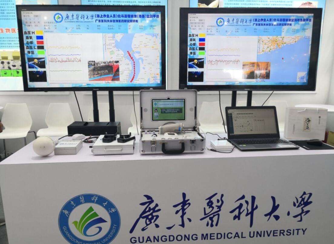 这是本次海博会广东医科大学的展位上,该校海洋医药研究院展示其研制的基于北斗远程健康监测系统与急救指挥平台。该系统开启了运用北斗通信建立起海上作业人员实时健康监测与急救指挥的绿色通道。