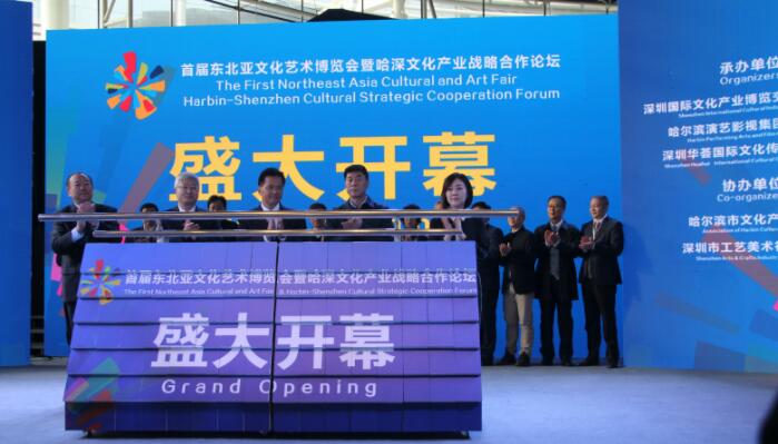 開幕式上,黑龍江省委宣傳部副部長劉維寬,哈爾濱市委常委、宣傳部部長焦遠超,深圳市文化體制改革和發展辦公室主任劉文斌,哈爾濱演藝影視集團董事長徐鶴東,深圳國際文化產業博覽交易會有限公司副總經理李丹女士,共同上臺推桿,首屆東北亞文化藝術博覽會正式開幕。