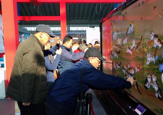 在國家級工藝美術大師作品展區內,一幅薛生金大師的作品——平遙推光漆器《百貓戲春圖》成為廣大市民矚目的熱點。“咔嚓、咔嚓……”廣大市民紛紛舉起手中的相機、手機,記錄畫面上的101只形態各異的貓咪,她們還不時地發出讚歎:“真是太逼真、太漂亮了!”拍照最認真的當屬冰城市民李先生,他要把101只貓都拍下來,回去製作電子相冊分享給家人和朋友。