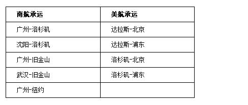 双方将在南航承运的广州-洛杉矶、广州-旧金山、广州-武汉-旧金山、广州-纽约、沈阳-洛杉矶,以及美航承运的达拉斯-北京、达拉斯-浦东、洛杉矶-北京、洛杉矶-浦东等中美主干航线上实现代码共享,高峰期每周联合提供64个航班。