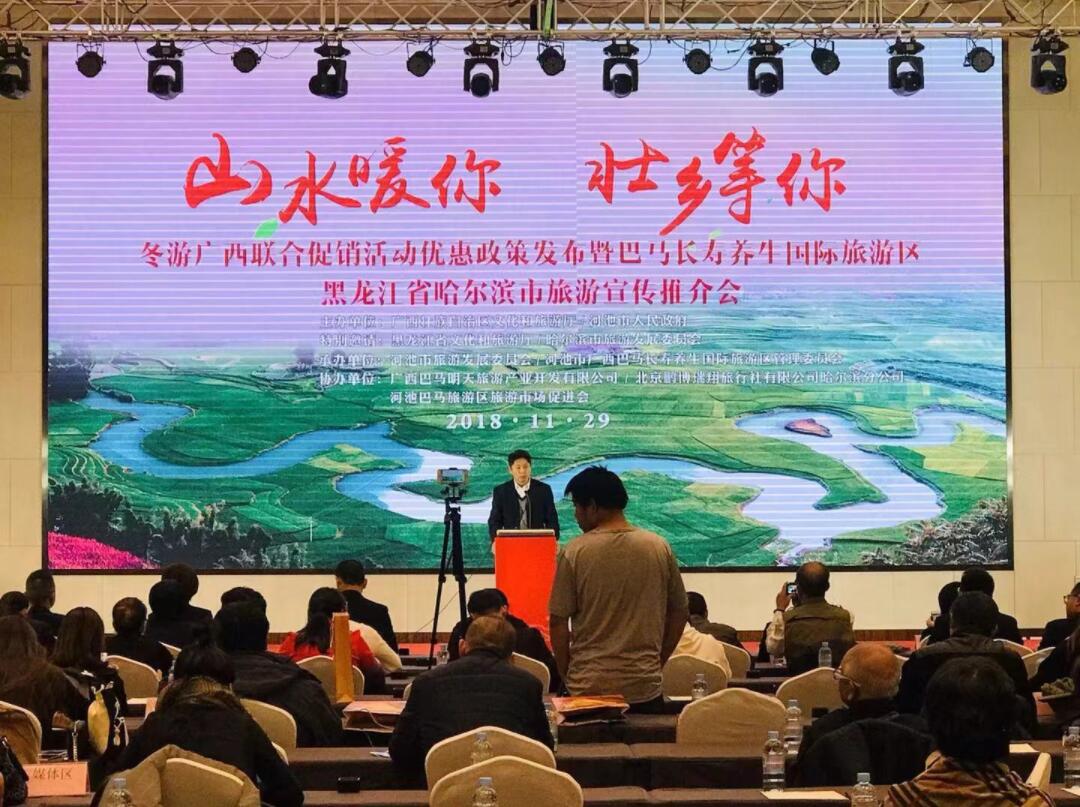 【香港商報網訊】11月29日,由廣西壯族自治區文化和旅遊廳、河池市人民政府主辦,河池市旅遊發展委員會、河池市廣西巴馬長壽養生國際旅遊區管理委員會承辦的2018“山水暖你 壯鄉等你——冬游廣西”聯合促銷活動優惠政策發佈暨巴馬長壽養生國際旅遊區黑龍江省哈爾濱市旅遊宣傳推介會在黑龍江省哈爾濱市隆重舉行。