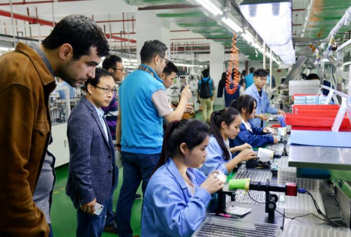 世界主流媒體記者參觀鶴山得潤電子科技有限公司電子元件生產線。