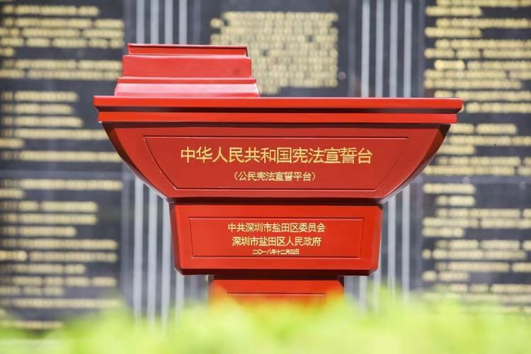 12月4日,“全國首個公民憲法宣誓平臺”在深圳市鹽田區沙頭角揭幕。鹽田區委區政府與市司法局研究決定,將原“東和法治文化公園”正式更名為“深圳憲法公園”,并在該公園內搭建憲法墻、永久憲法宣誓臺等設施,作為普通市民向憲法宣誓、表達尊憲愛國情感的場所和平臺。揭幕當天,來自各部門機關干部代表和來自社會各界的市民代表佇立在憲法宣誓平臺,面向憲法墻,舉起右手,向憲法莊嚴宣誓,切身體驗憲法的神圣感、莊嚴感。