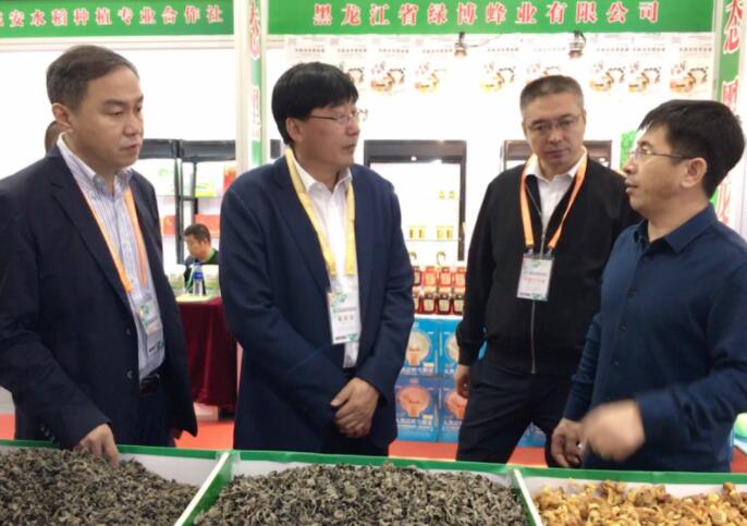 黑龍江省農業農村廳副廳長李世潤(左二)在黑龍江省綠色食品發展中心主任王蘊琦(左一)的陪同下在有機食品展區巡館