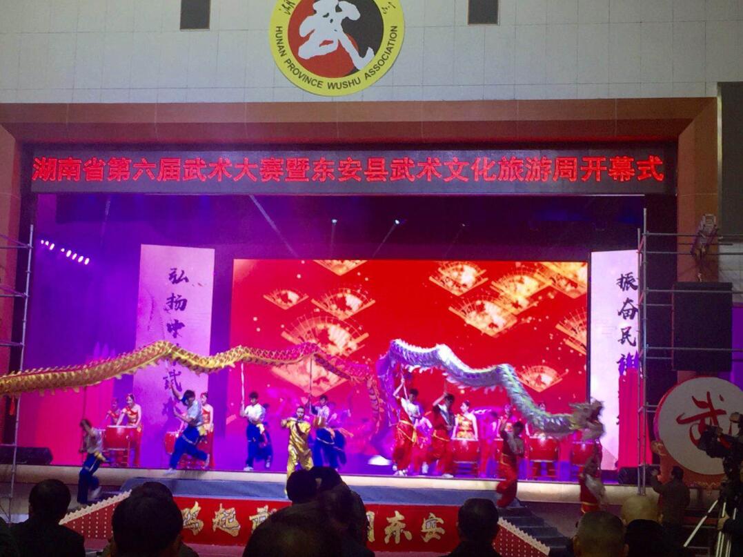 【香港商報網訊】聞雞起武,徳潤東安。12月8日上午,湖南省第六屆武術大賽暨東安縣第三屆武術文化旅遊周在東安一中體藝館隆重開幕。在為期兩天的活動中,安排了湖南省第六屆武術大賽、湖南省第六屆武術精英大賽、拳王征戰——國際拳王爭霸三項大賽,來自5個國家以及湖南省14個市州75個代表隊的1200名運動員將參加角逐。湖南省政協原副主席、省文聯主席歐陽斌宣佈湖南省第六屆武術大賽暨東安縣第三屆武術文化旅遊周開幕,並與眾多嘉賓一道啟動開幕式按鈕。湖南省武術協會主席陳正培,中國武協特邀副主席晏西征,永州市委常委、紀委書記楊永在開幕式致辭,東安縣委書記馮德校致歡迎辭,並為武僧一龍頒發“東安武術推廣大使”證書,東安縣委副書記、縣長龍向洋主持開幕式。