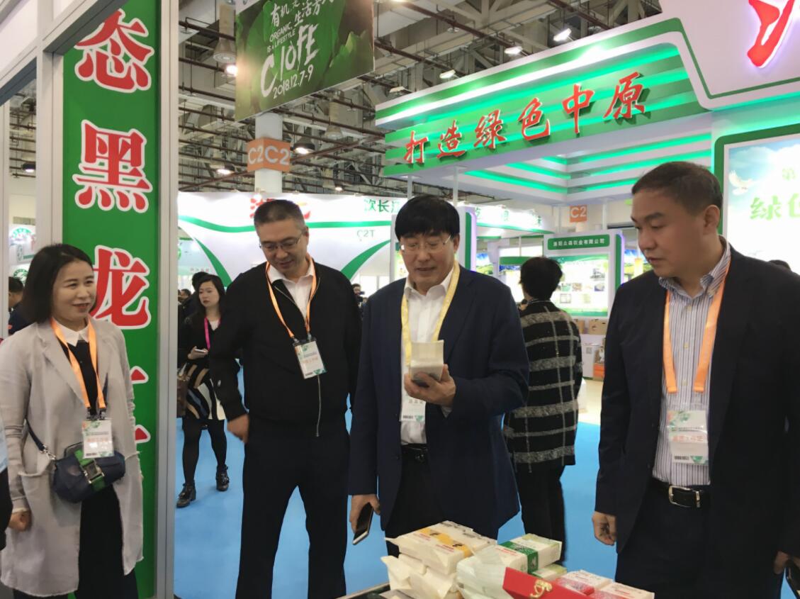 黑龍江省農村農業廳副廳長李世潤、黑龍江綠色食品發展中心主任王蘊琦與雙鴨山參展商交流產品特色