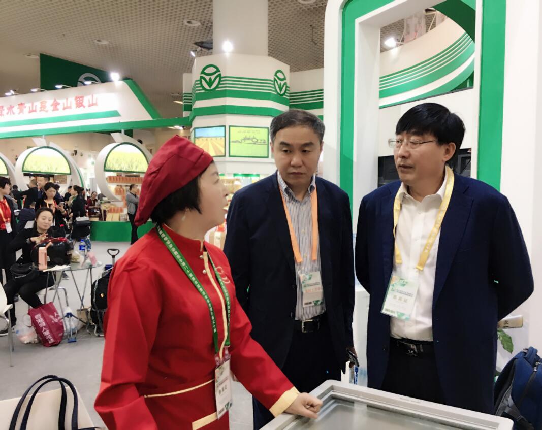 黑龍江省農村農業廳副廳長李世潤(右一)、黑龍江綠色食品發展中心主任王蘊琦(右二)了解凍豆腐產品特點