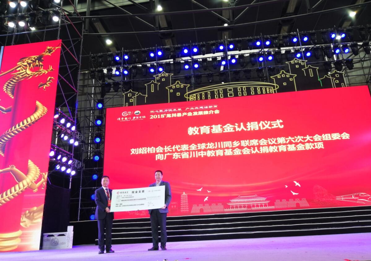 期间,全球龙川同乡联席会议副主席、深圳市龙川商会会长刘绍柏代表全球龙川同乡联席会议第六次大会组委会,向广东省川中教育基金会捐赠筹备大会结余资金作为教育基金。霍山画院院长骆振艺代表霍山画院向龙川县人民政府赠送原创霍山中国画青花瓷作品,县长杨利华代表龙川县人民政府上台接受捐赠,并回赠“热心家乡发展、助力文化繁荣”牌匾。