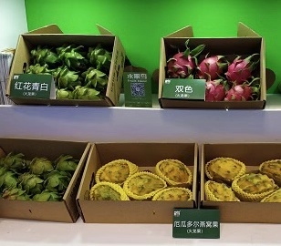 六枚火龍菓就有十斤多,來自海南東方的菓農請記者品嘗,菓大、多汁、肉紅、味甘,散發玫瑰芳香,這是他們今年的新品。三亞水菓島農業科技有限公司總經理張茗翔告訴記者,他們成功培育出厄瓜多爾燕窩菓、紅寶龍、紅花青白、紫霧、艾琳娜等十餘種火龍菓,極具經濟價值與市場前景,希望借助本次冬交會的平臺找到合作伙伴。