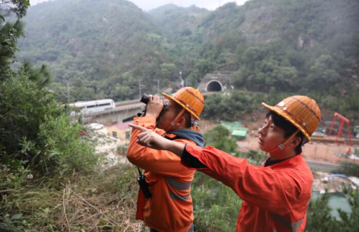福州工務段福州路橋車間職工利用望遠鏡觀察杭深線燕前二號隧道口山體情況