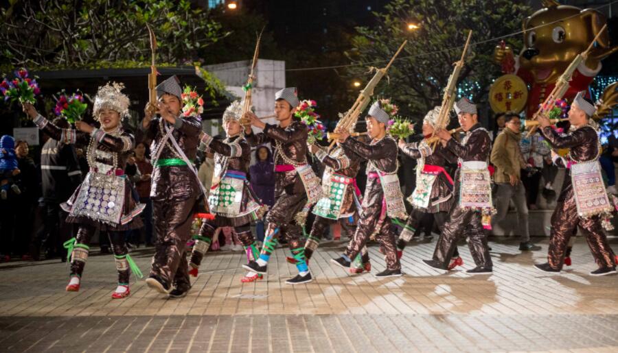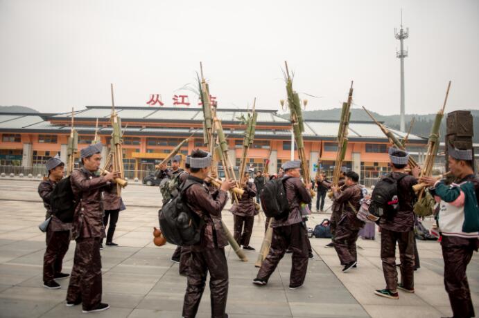 表演隊員在貴廣高鐵從江站前廣場吹奏蘆笙準備出發澳門。 吳德軍 攝