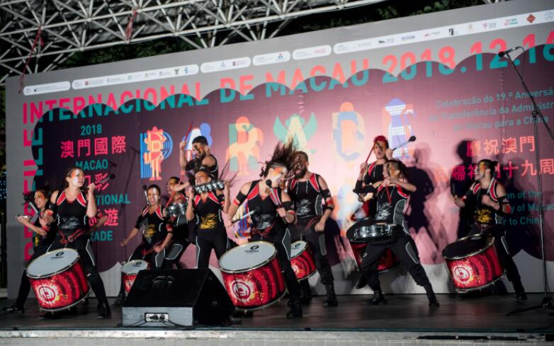 【香港商報網訊】13日,貴州省從江縣丙妹鎮大塘蘆笙舞蹈表演隊抵達澳門特別行政區,并在佑漢街市公園廣場參加慶祝澳門回歸祖國十九周年“2018國際幻彩大巡游”預演活動,苗族小伙姑娘們與來自巴西 — 小馬戲莉維亞、莫桑比克 — Hodi 文化藝術團、幾內亞比紹 — Toku Di Djambadon 傳統舞蹈團、哥倫比亞 — 愛自由勁鼓團等國家杰出藝術團隊同臺演出,他們精彩的表演贏得了在場的觀眾陣陣掌聲。