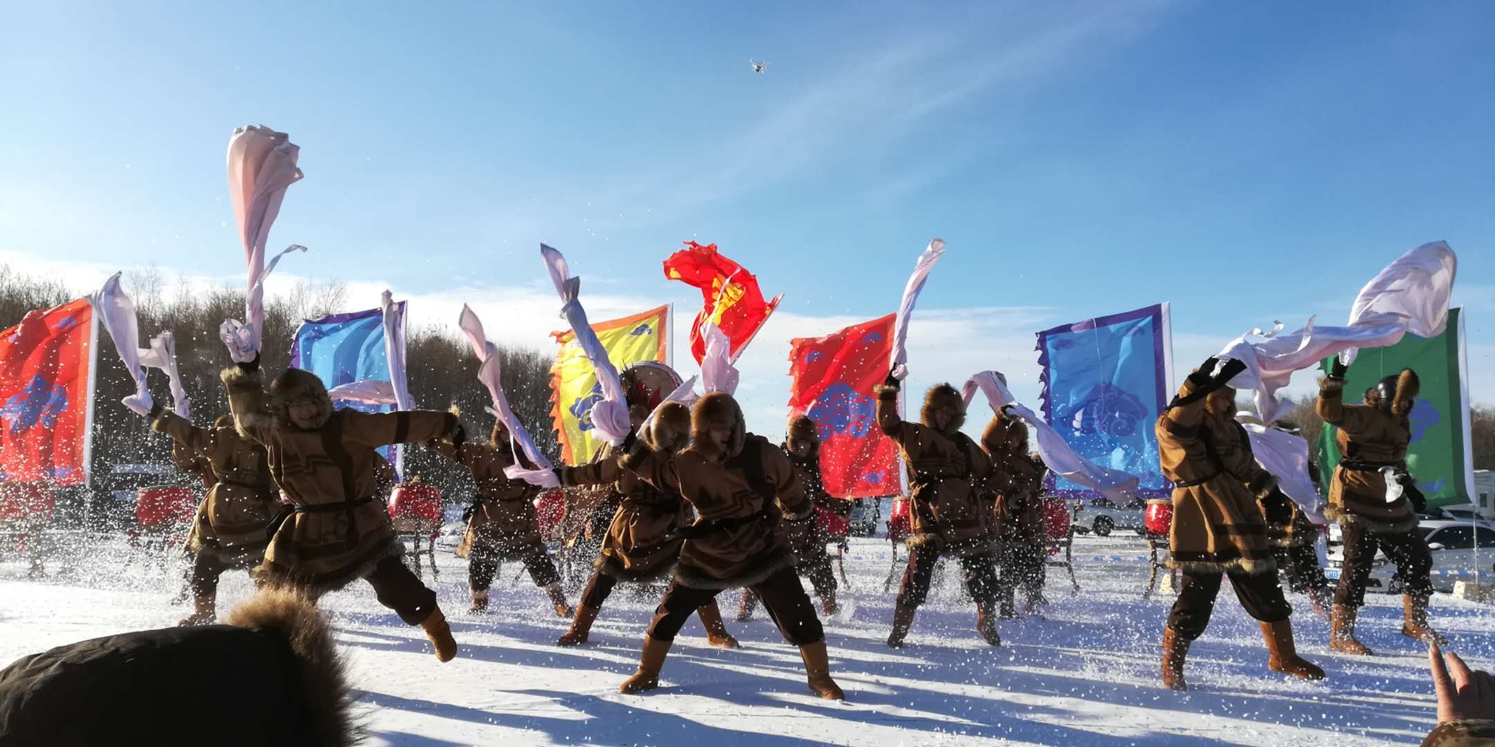 樂舞祭拜是冬捕中必不可少的的活動環節,漁民們用東北四小民族的古老歡快民族舞蹈形式,展現他們對大自然恩賜的敬意。藝術與民俗相碰撞出最為燦爛的火花,九座大鼓分排而立,響動在祭臺周圍,打造“九鼓響天地”的氛圍,魚把頭手持祭湖拜文恭讀,漁民們紛紛舉起裝滿美酒的“東北海碗”,敬天敬地敬五大連池,整個場面氣勢恢宏,是整場“火山冬捕”活動的精彩華章。