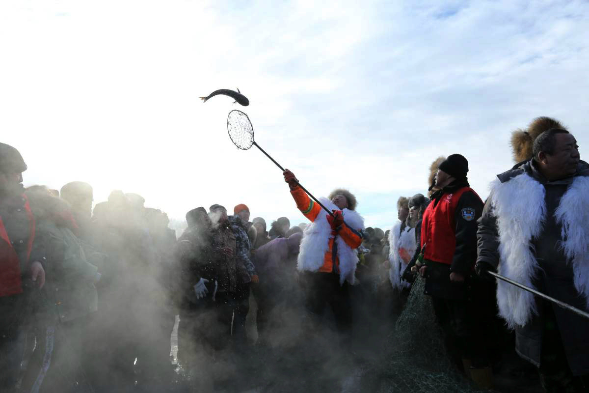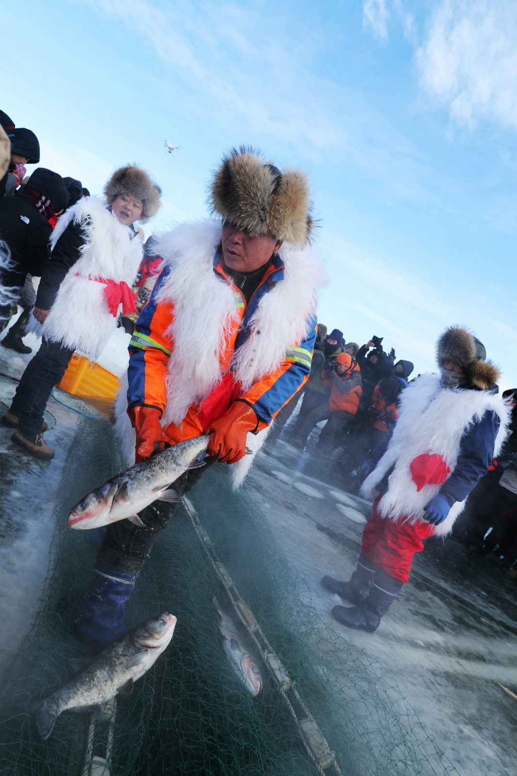 祭祀儀式后,漁把頭與上百名漁民們身著東北皮毛大衣緊抓漁網,齊聲高喊起網號子,慢慢將漁網拉出冰面,“出魚了!”伴隨三聲高亢嘹亮的號子響徹湖面,漁民們奮力向一端將網拉出冰面,一條條身肥體壯的礦泉魚在水汽蒸騰中跳躍而出。漁民們將網中活魚撒在冰面之上,作為新年的好彩頭,中外游客競相挑選心儀的大魚,將“連年有餘”帶回家。