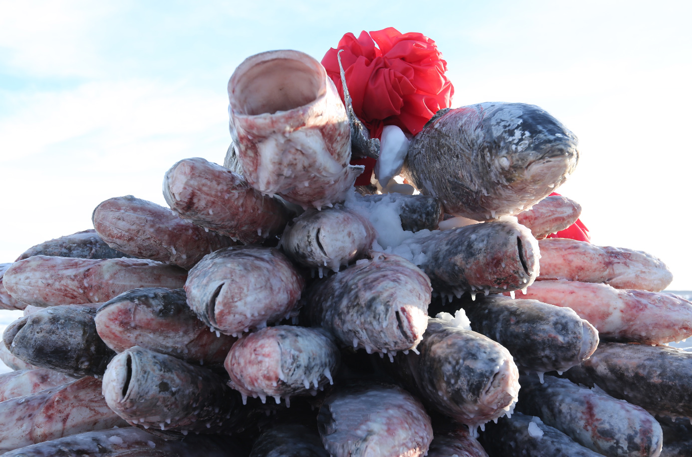 千百年來,深邃沉靜的湖水養育了億萬生靈,古老的祭湖醒網儀式仿佛帶著人們回到了遠古。漁把頭帶領眾人凈手焚香、向天祈福,在冰雕供臺上供奉五谷,保佑風調雨順,五谷豐登。
