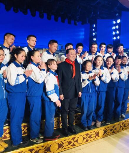 天真無邪的學生們為了感謝大巴扎大劇院的的盛情邀請,學生代表特向寧琦先生(國際大巴扎總裁)佩戴紅領巾以表敬意,並贈送一幅畫由聾人學校徐世傑老師畫作 《天山深境》表示感謝。