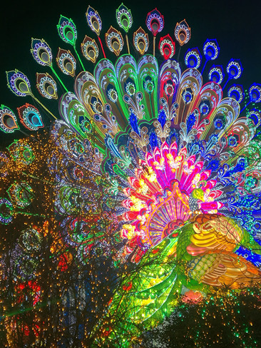 在湖中央,以中國山水畫為基調,一隻高達22米的巨型孔雀昂立湖面。夜幕降臨,湖面水霧溢動,騰于山巒的仙鶴和孔雀活靈活現,宛如一軸盛世吉慶祥和,美輪美奐的瑰麗畫卷。這是本屆燈會最大型的群組式燈組《盛世華章》,燈組總高34米,佔地面積達6000平方米。燈組前,人頭攢動,紛紛讚歎其藝術震撼力。
