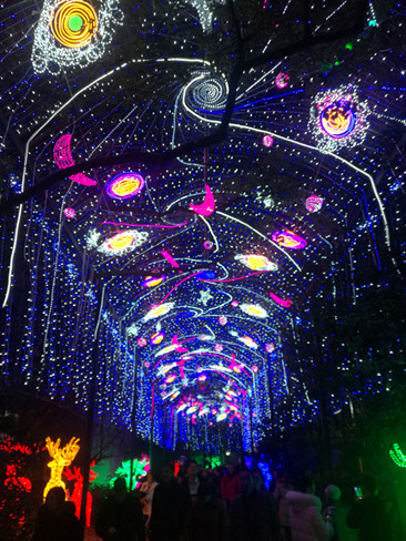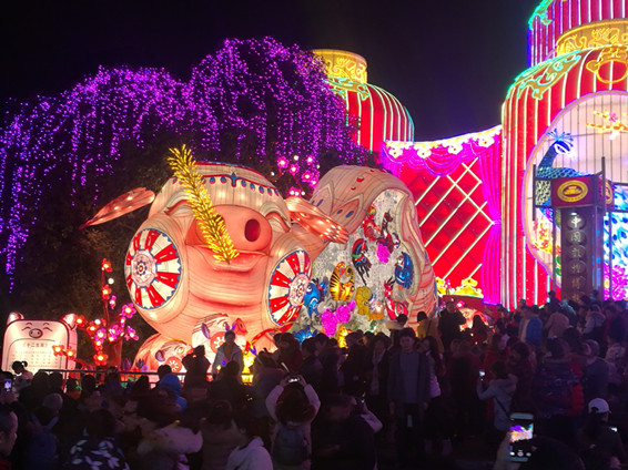 走進彩燈公園,首先映入眼帘的是《華夏樂章》這組巨無霸彩燈,它創造了自貢燈會歷史上「瓷器燈之最」。這個以「中國編鐘」造型的大瓷器燈組,高30米、直徑25米,重達102噸,共使用了20餘萬件瓷器捆紮而成,盤子、調羹、瓷杯、酒杯……巧奪天工般地打造出氣勢恢弘的彩燈。