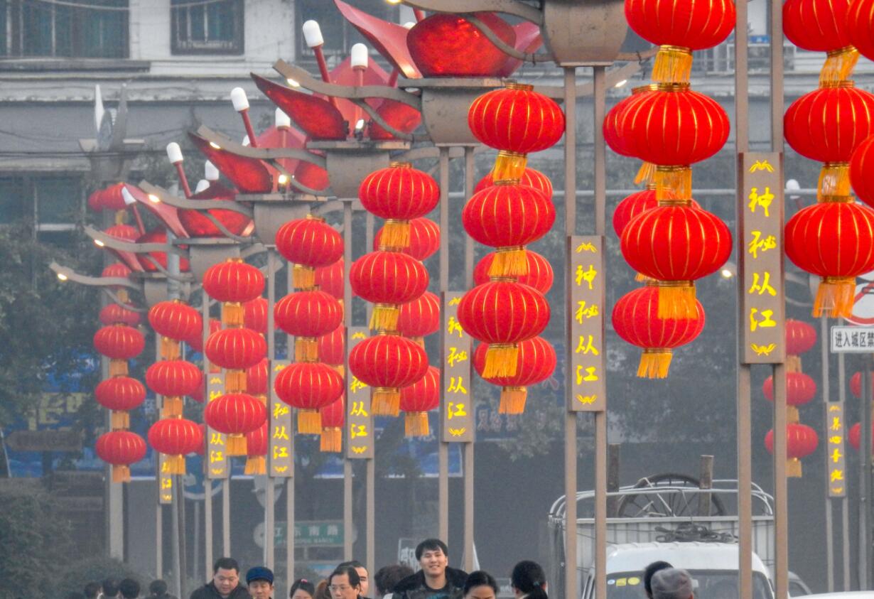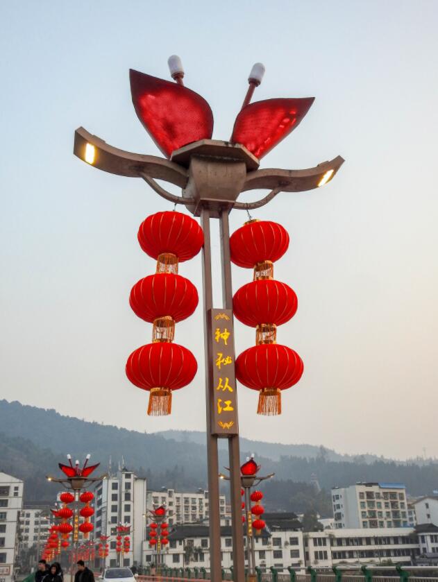 2019年1月21日,在貴州省黔東南苗族侗族自治州從江縣城大橋拍攝的燈杆上掛滿了紅燈籠(吳德軍攝)