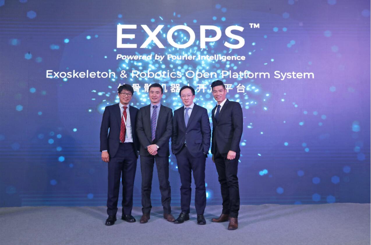 (從左往右)墨爾本大學機械工程系Denny Oetomo教授、美國國家儀器(NI)大中華區銷售總監喬巍、傅利葉智能CEO顧捷和傅利葉智能首席戰略官Zen KOH現場一起啟動外骨骼機器人開放平臺