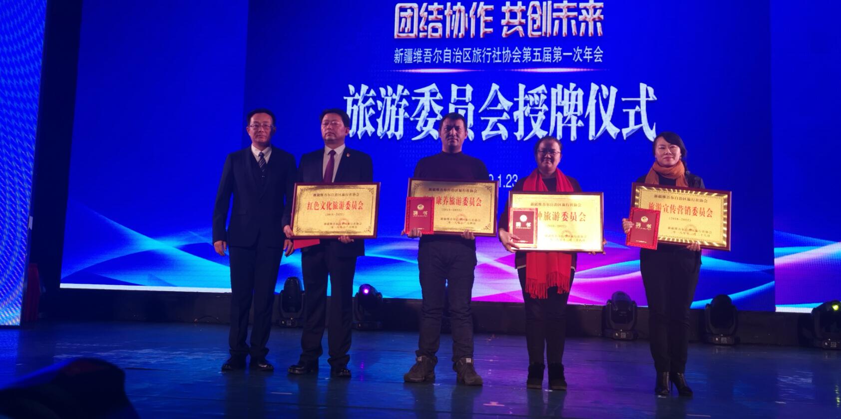 新疆自治區旅行社協會會長吳鋒(左一)為新入會旅遊委員會授牌