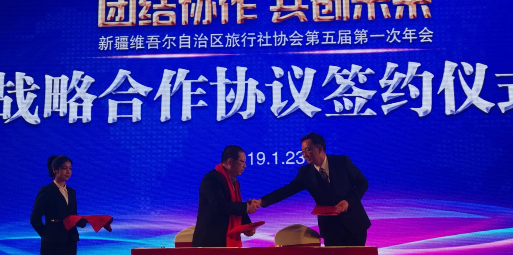 新疆自治區旅行社協會會長吳鋒(右)與其他協會簽訂戰略合作協定