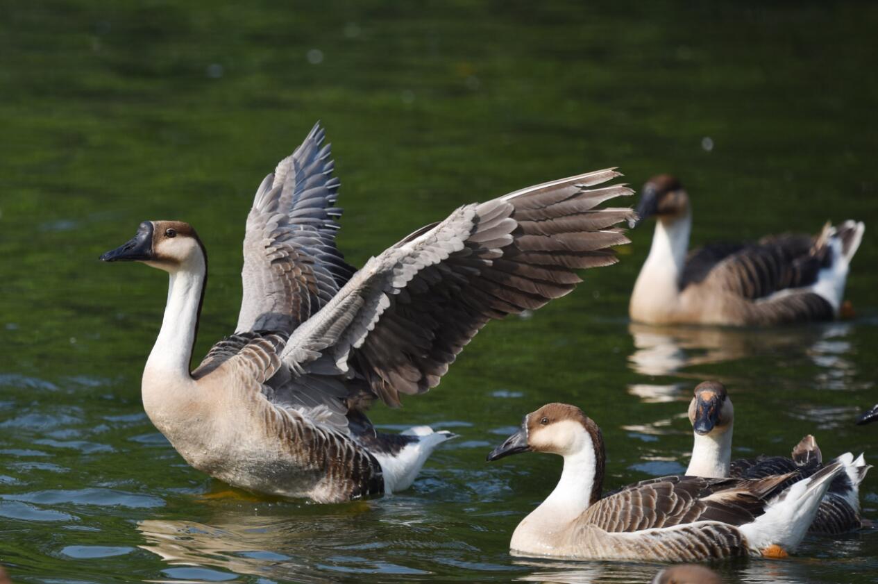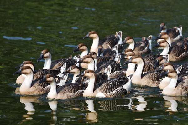 在深圳野生动物园天鹅湖里,30只鸿雁面对新的环境显得有点陌生,它们各自迅捷地向着湖水中央游去。由于鸿雁喜欢结群生活,10多分钟后,它们很快就相聚在一起,似乎适应了新的环境,有的在戏水,有的在梳理羽毛,有的在潜水玩耍,它们尽情地展示美姿,呈现一派生机勃勃的景象。