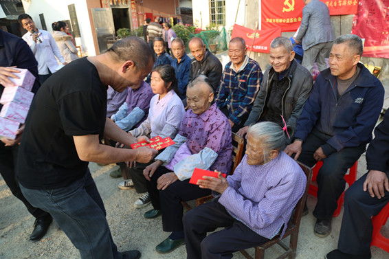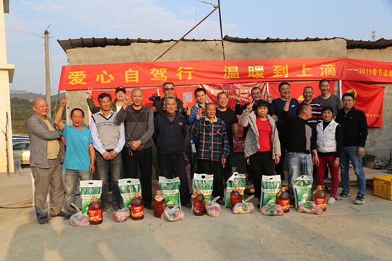 据了解,上滴村位于四会市绥江河畔,共有20多户,100多位村民,山青水秀原生态地域,目前青年人外出打工,留守都是老年人和儿童。本次活动由协会副会长张建友主导,把捐献的一批大米、花生油、猪肉以及书籍糖果杯子等生活日用品,满载着爱心和温暖,饱含深情厚谊,一大早他们从深圳浩浩荡荡出发,经过四个多小时长途跋涉,来到了四会市上滴村,受到了一百多名村民的热忱欢迎和盛情接待。上滴村小广场上,欢歌笑语,老少开颜。下午十六时许,举行了简朴而又隆重的献爱心仪式,随后,副会长张建友给村里每一户人家代表分发了大米、豆油和猪肉等,还给参战老兵、低保户以及每一位70岁以上老人分发现金红包,送上满满的新春祝福!全体村民幸福弥漫,笑容满面,和自驾车队成员大联欢,献出了戏曲、舞蹈、歌唱等精彩节目并与全体村民共享大盆菜丰盛晚宴,在互相祝福新年,互道珍重中,圆满结束了本次送温暖活动。