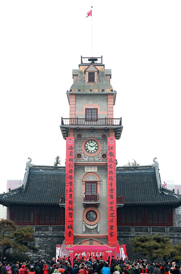 南通12米春聯亮相百年鐘樓