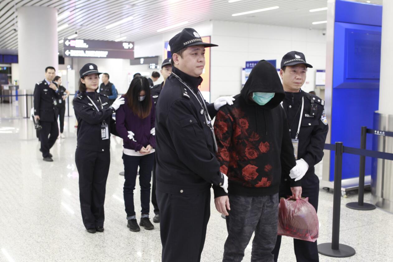 海关缉私警察押送两名出逃境外的嫌疑人抵达广州白云机场(丘永忠摄)