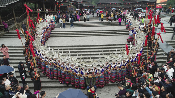 當天,苗族姑娘們端起酒壺,在台階上排好隊,就等遊客體驗,一位青年小伙欣然接受挑戰,他站到了隊伍的最前面,並把一個大大的酒碗放在了嘴邊……一切準備就緒,姑娘們就倒起酒來,自上而下,形成溪流,源源不斷地流入了客人的嘴裏……同時,一旁苗家漢子吹響了蘆笙,現場沸騰起來了。
