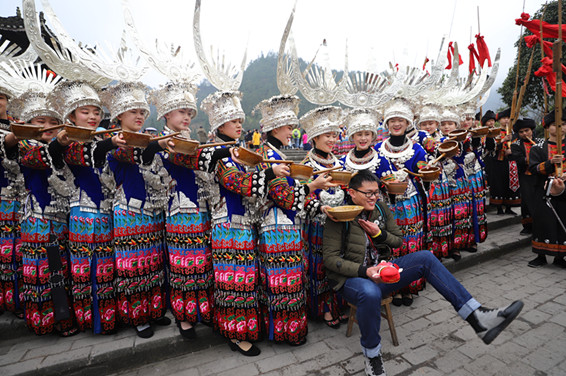 遊客在苗寨體驗敬酒方式「高山流水」的情景
