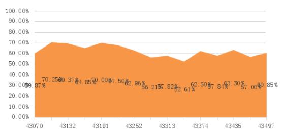 从私募的仓位来看,目前股票策略型私募基金的平均仓位为60.85%,相比上个月同期的57.00%,环比上升了接近3.85%的仓位。结合最近半年的仓位变化情况来看,私募整体的仓位是呈现区间震荡走势,最近半年基本处于52%至65%区间变化。就目前整体仓位来看,私募仓位水平处于比较适中的状态,处于进可攻退可守的状态。