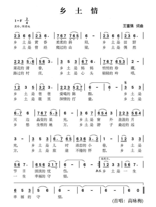 《鄉土情》由國家一級演員、全國青聯委員、中國音樂家協會會員、中國戲劇家協會會員、女高音歌唱家高詠梅首唱