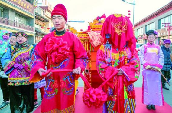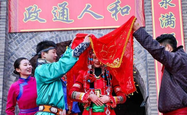 歌舞表演《蒙古族婚禮》在塞上老街西口鐘鼓樓上演,市民現場感受蒙古族婚俗風情。婚禮分為哈達訂親、攔門迎婿、分發出嫁、母親祝福、聖火洗禮、跪拜公婆、掀開面紗、新娘敬茶等儀式,呼麥、長調、馬頭琴、筷子舞等民族特色表演穿插其中。據瞭解,此次大召文化廟會鐘鼓樓表演以婚禮文化為主基調,編排了蒙古族婚禮表演、傳統漢族婚禮表演以及繡球招親表演,旨在打造一台集知識性、娛樂性、趣味性為一體的綜合性文藝演出。《蒙古族婚禮》以內蒙古東部的科爾沁地區、西部鄂爾多斯地區以及中部烏珠穆沁地區等地的蒙古族婚禮儀式與習俗為藍本,經過藝術加工,濃縮精華內容,將風俗、禮儀、服飾、歌舞、音樂融於一體,寓情於舞,以歌傳情,展示了蒙古族傳統文化的獨特魅力。