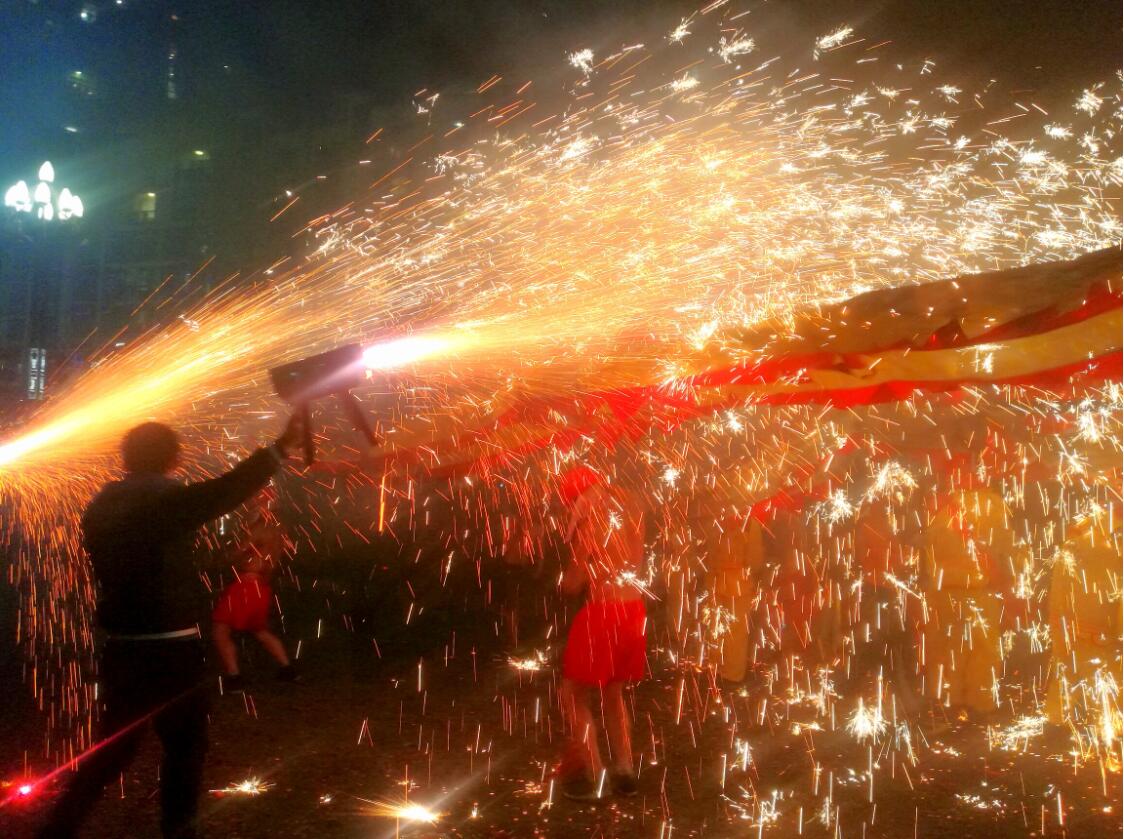 記者在“舞龍噓花”現場看見,舞龍者赤身光臂盡情舞動,噓花者點燃花筒,火焰噴射數丈之遠,花筒噓放時能噴出三、五米高的開花火焰,對空放如火樹銀花,用這樣的花筒噓龍燈,每筒可跟龍連噓幾十米,形成一片強烈的火海,舞龍者則英勇無畏地在火海中跳躍奔騰,全奮力拚搏,奮勇前進,整個場面驚險、刺激、火爆。