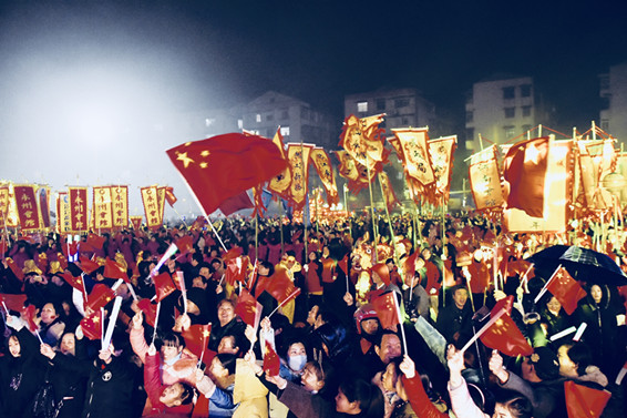 「元宵送龍大典」儀式開始之前,在洪江區體育中心,10萬人歡聚一堂,齊唱《我和我的祖國》,向祖國70華誕獻禮,送上最美好的祝願。伴着激揚的旋律,踏着歡樂的節拍,現場頓時歡騰起來。大家舞動著國旗,如同陣陣翻滾的紅色熱浪,氣勢恢宏。大家高歌熱舞,表達對祖國母親美好的祝願和對黨的真摯祝福。偌大的廣場霎時變成了一片紅色的海洋,直接將活動帶入高潮,也拉開了元宵送龍大典活動的序幕。