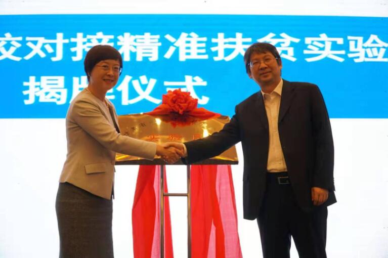 教育部學校規劃建設發展中心主任陳鋒(右)和甘肅省委教育工委書記、省教育廳廳長王海燕(左)共同為「甘肅省農校對接精準扶貧實驗區」揭牌