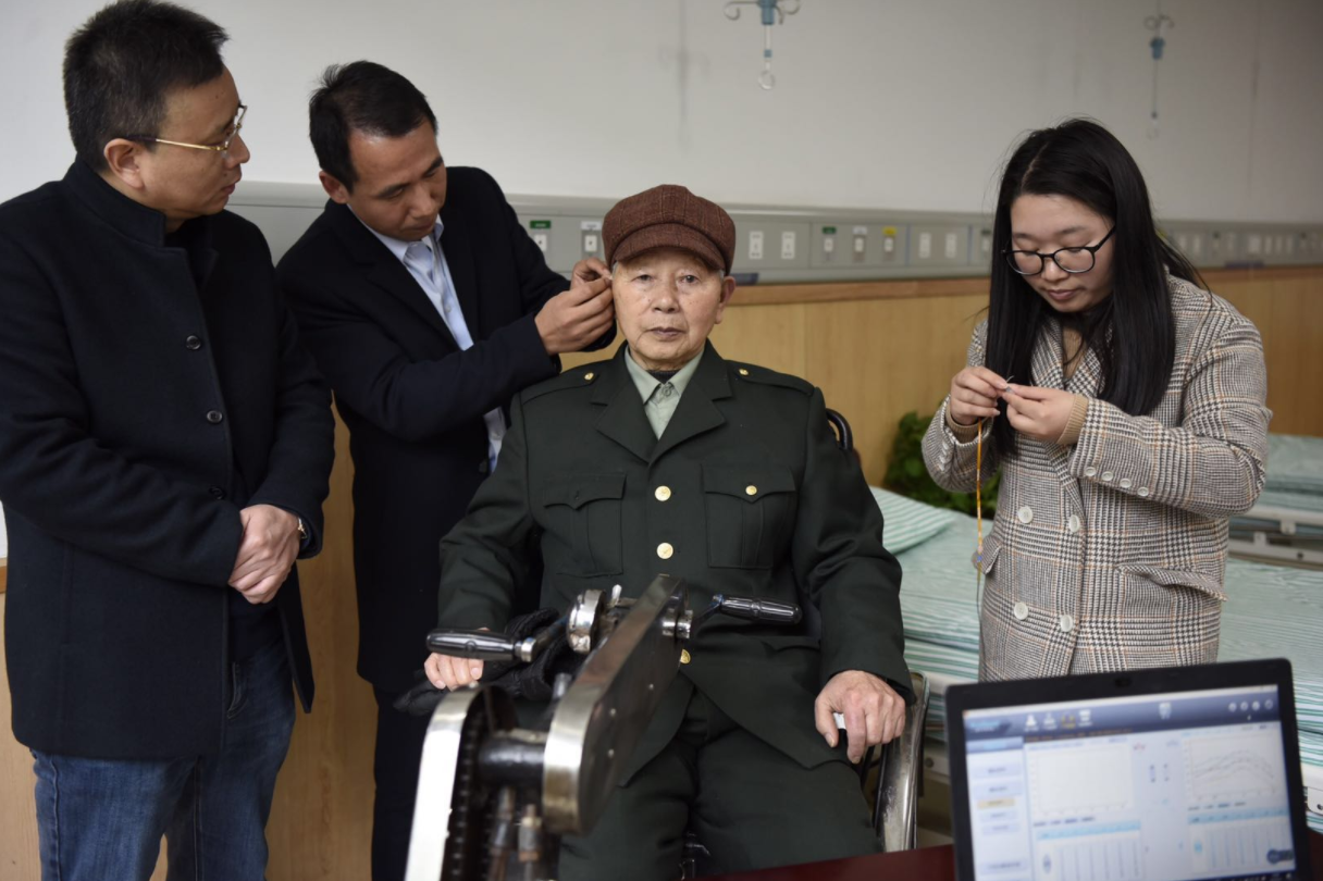 張新根院長(左一)陪同愛聽科技李總(左二)給聽障老兵安裝助聽器