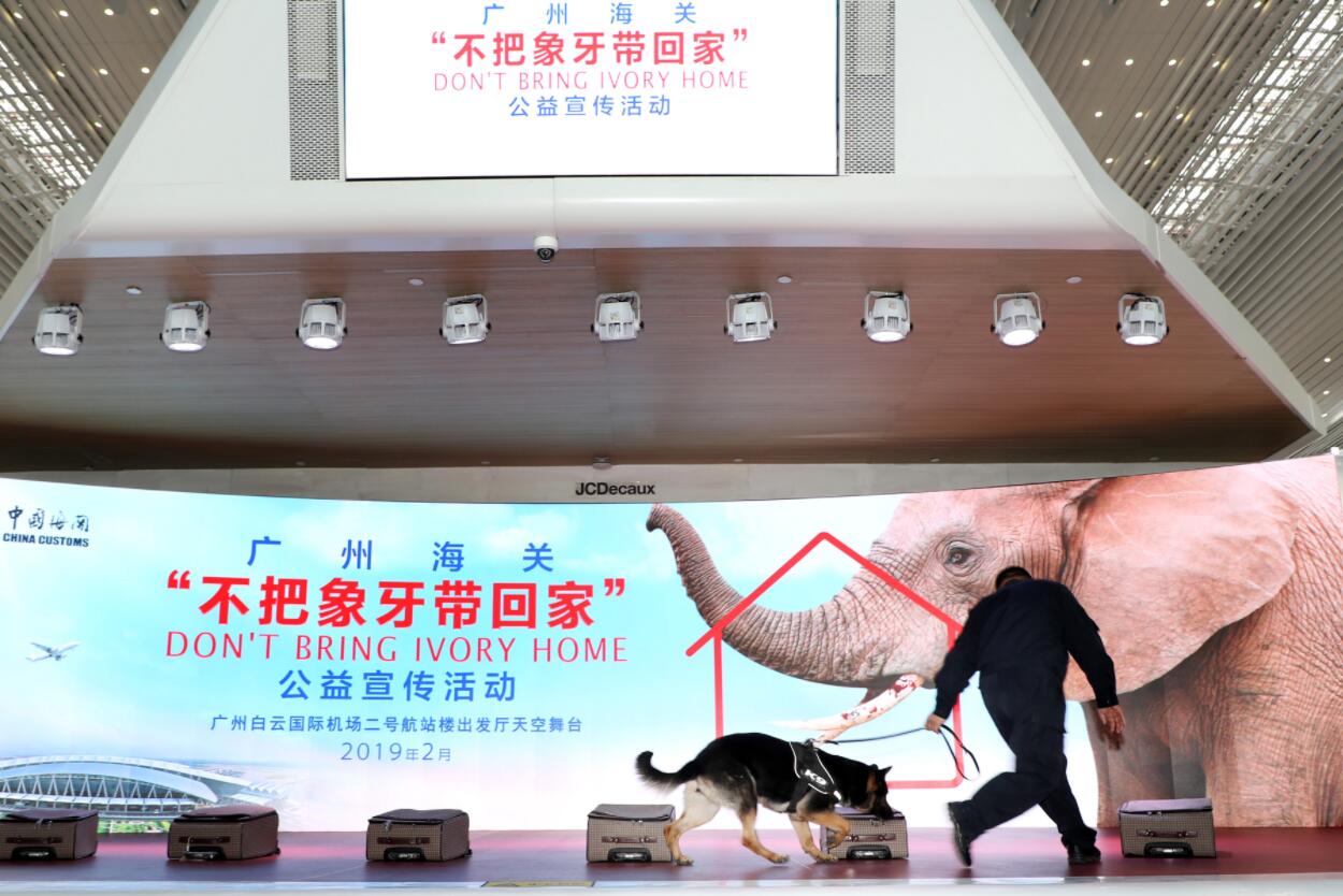 在緝私犬表演環節,服役6年的拉布拉多犬「金凱」閃亮登場,不足30秒嗅探出藏有一袋象牙製品的行李箱。作為全國罕見的瀕危物種搜查犬, 金凱能準確識別象牙、犀牛角、穿山甲鱗片、虎骨、象皮等多種瀕危物種及製品的氣味。金凱已累計查獲走私象牙案31宗,繳獲象牙製品37公斤。