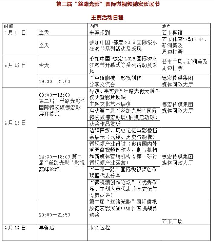 第二屆「絲路光影」國際微視頻德宏影展節主要活動日程