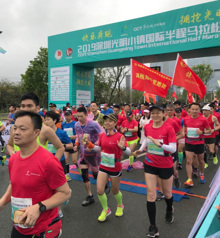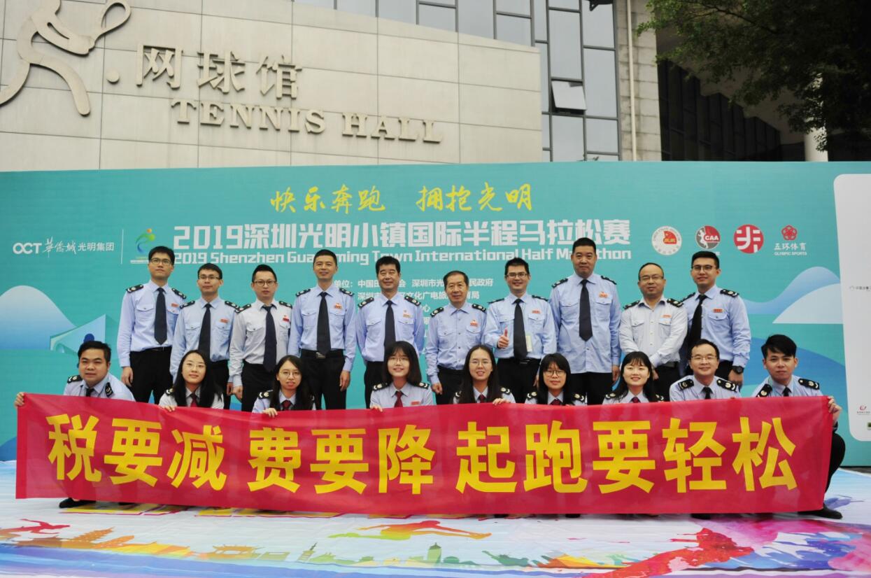 【香港商報網訊】記者 黃鳳鳴 報導:2019年3月24日上午8時,深圳光明小鎮國際半程馬拉松賽鳴槍開跑,賽道中有一幅「減稅降費助跑光明」的大旗吸引了跑友和觀賽者的目光,光明區稅務局20名宣跑團運動員,邁開矯健的步伐,跟隨着8000名運動員,一邊享受運動的樂趣,一邊宣講減稅降費。