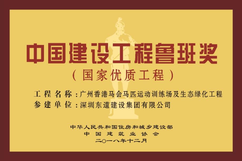 中國建設工程魯班獎(國家優質工程)(China Construction Engineering Luban Prize(National Prime-quality Project))簡稱魯班獎,是一項由中華人民共和國住房和城鄉建設部指導、中國建築業協會實施評選的獎項,是中國建築行業工程質量的最高榮譽獎。此次獲獎的廣州香港馬會馬匹訓練場(簡稱馬會項目)是香港馬會在內地投資的首個項目,也是內地首個獲得國際認可的無疫區、最大規模、擁有國際標準設計的跑道,更是內地唯一具備舉辦國際馬術比賽條件的馬場類綜合體。在馬場項目的建設過程中,運用了BIM技術、無人機、機械人、VR、AR等高新科技應用,在綠色建造方面成果卓越。截至目前,該工程已獲得11項發明型專利、3項外觀專利、37項實用新型專利共計51項專利,成為內地首個擁有50+專利的大型項目,填補了內地在國際標準馬場建設方面的空白。
