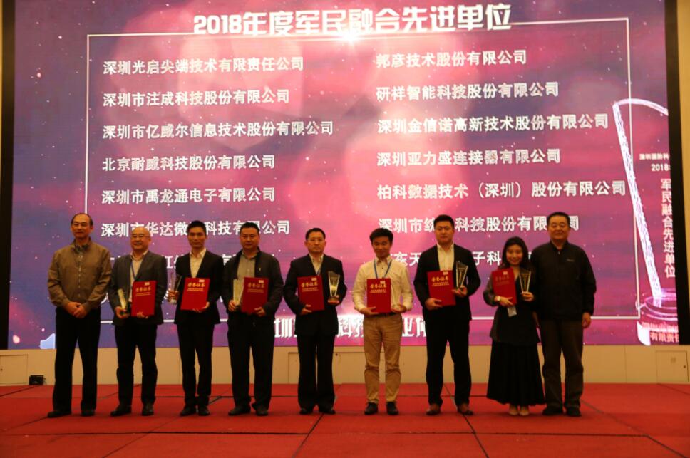 深圳軍工雖然起步晚,但企業發展速度快、客戶響應速度快,得到軍方用戶一致認可和好評。為表彰先進,樹立標桿,引導和激勵更多的軍民融合優勢企業參與武器裝備科研生產,促進軍民兩用技術成果轉化,推動科技軍民融合深度發展,大會對2018年度湧現出的15家「軍民融合先進單位」進行表彰,為深圳光啟尖端技術有限責任公司、邦彥技術股份有限公司、深圳市注成科技股份有限公司、研祥智能科技股份有限公司、深圳市億威爾信息技術股份有限公司、深圳金信諾高新技術股份有限公司、北京耐威科技股份有限公司、深圳亞力盛連接器有限公司、深圳市禹龍通電子有限公司、柏科數據技術(深圳)股份有限公司、深圳市華達微波科技有限公司、深圳市統先科技股份有限公司、廣州颯特紅外股份有限公司、廣東天珩通電子科技有限公司、天利航空科技深圳有限公司等企業頒發獎盃和證書。