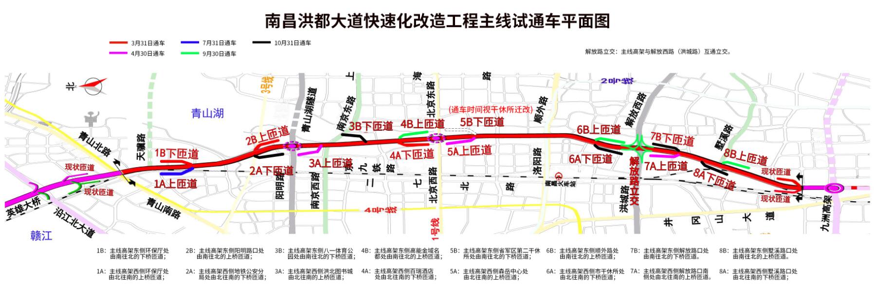 剩餘部分匝道受房屋拆遷、管線遷改、施工場地狹小、交通通行等因素影響,在保障洪都大道道路交通不中斷的前提下無法與主線高架同時施工,需分批組織施工,分批開放。計劃於2019年4月底實現3A、5A、7A匝道通車,7月底完成1A匝道通車,2019年9月實現北京路至九洲高架段的4B、6B、8B匝道通車,2019年10月底實現剩餘2A、3B、6A、7A、8A匝道通車,5B匝道暫不能確定通車時間。