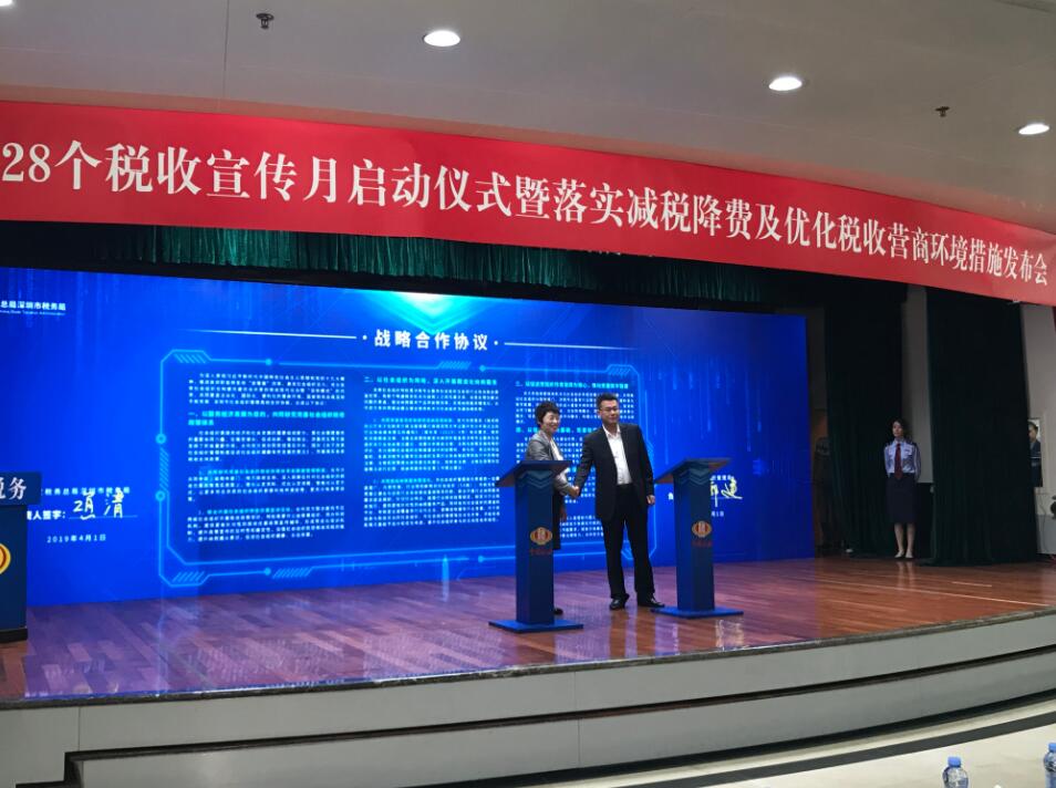 【香港商報網訊】記者 黃鳳鳴 報道:4月1日上午,深圳市稅務局以「落實減稅降費,促進經濟高質量發展」為主題,舉辦了第28個稅收宣傳月啟動儀式暨落實減稅降費及優化稅收營商環境措施發佈會。啟動式上發佈了「減稅降費措施十條」、上線「微稅務」,並與深圳市社會組織管理局現場簽約。4月1日起,增值稅稅率再次下調,當天順利開出增值稅新稅率發票的企業代表通過視頻連線,在啟動式上分享了收穫降稅紅包的喜悅之情。