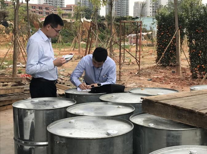 據悉,大朗在開展危化品大排查大整治工作中,相繼發現大朗鎮內企業有涉嫌非法儲存危化品行為,並及時採取措施處置。其中3月26日,大朗專職安全員在日常巡查中發現大朗物流園存在涉嫌非法儲存危化品行為,大朗應急管理分局獲悉後,組織執法人員前往處理,在東莞市華玉貨運代理有限公司發現存放疑似DMF(N,N-二甲基甲酰胺)8桶,共1.44噸。3月28日,執法人員再次對大朗物流園進行突擊檢查,查獲東莞市大朗贛通貨運部空地隨意擺放了22桶無標籤化學品,且未能提供化學品標籤和安全技術說明書。通過翻查單據,確認其中18桶為工業乙醇,5桶為二甲苯,共3.82噸。