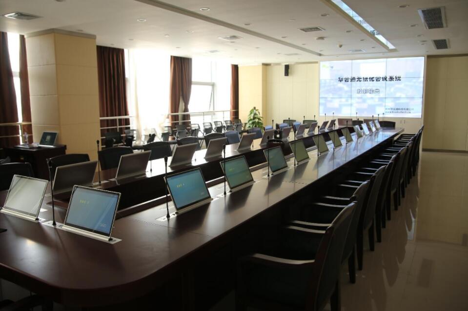 兩個會議室全部採用無紙化會議的新型形式,大會議容納144人同時開會,智能會議室容納50-60人開會,市區管理部和分中心全部實行視頻會議。智能會議室採用全套無紙化管理系統,包括一體機、話筒、明牌全部能一體升降,統一管理。開會前把所有的會議議程,會議文件,會議投票等全部創建好,開會整個流程,包括不用主講人都能把自己的屏幕投射到大屏和其它人屏幕給所有的參會人員看。會議提供簽到、議程、會議信息、筆記、會議投票等,每次會議結束所有的會議記錄都能電子化保存,供以後查看。