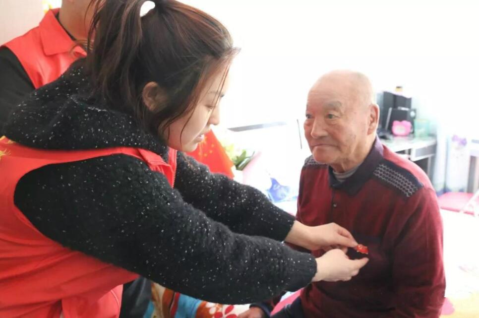 當志願者為建國前老幹部趙久仁佩戴上國旗徽章時,紅了眼眶的他臉上展現出燦爛的笑容。現年87歲的李玉江老人精神抖擻,不難看出年輕時是位勇敢的戰士,在1950年參加過抗美援朝,1951年榮獲三等功2次,在他的家中,志願者為他佩戴上了國旗徽章,他激動得說:「有國才有家,我們現在很幸福!」